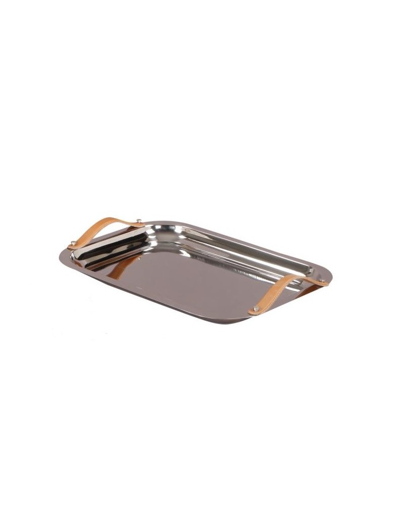 BANDEJA RECTANGULAR GRANDE EN ACERO CON ASAS EN CUERO.